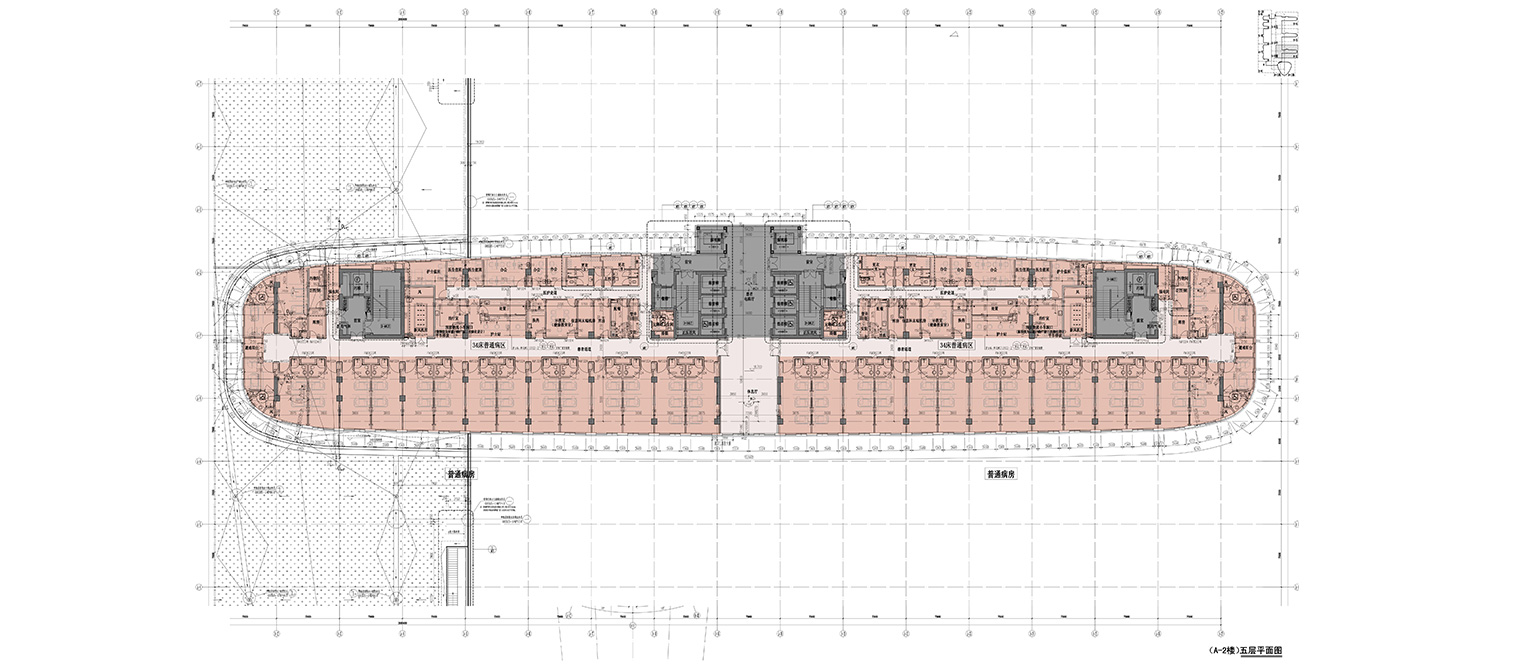 在病房樓與A5醫(yī)技樓相連接處,采用嵌套式結(jié)構(gòu)縫,滿足建筑手術(shù)區(qū)內(nèi)的凈化要求。