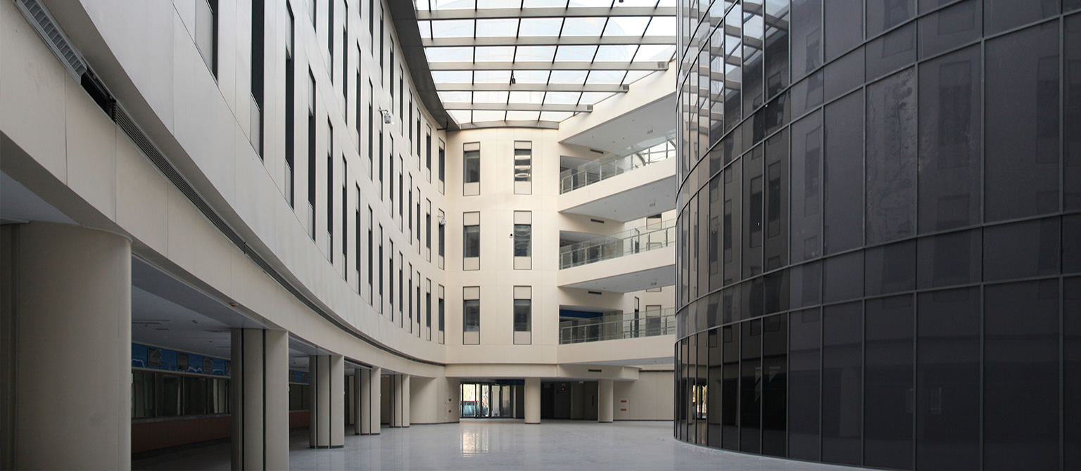 天壇醫(yī)院A1門診樓是鋼框架加支撐的結(jié)構(gòu)體系,平面是內(nèi)圓與外環(huán)通過三道連橋連同的造型。外環(huán)輪廓是圓形與等邊三角形的融合,直徑約80m,結(jié)構(gòu)沿徑向滿布兩跨框架。中間的圓形大廳直徑26m,根據(jù)建筑需要,中心是一個(gè)直徑18m的圓形無柱空間,通過三相框架梁互相搭接形成。內(nèi)外連接通過三道跨度14m的鋼橋連接,并形成三個(gè)大中庭空間。