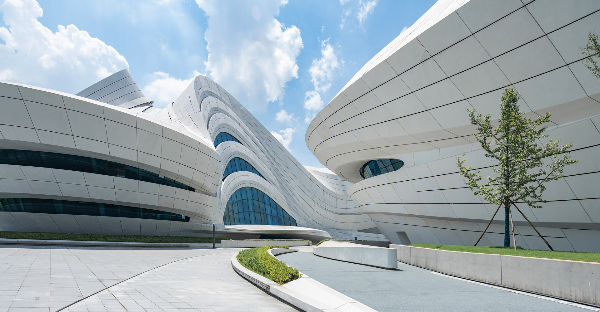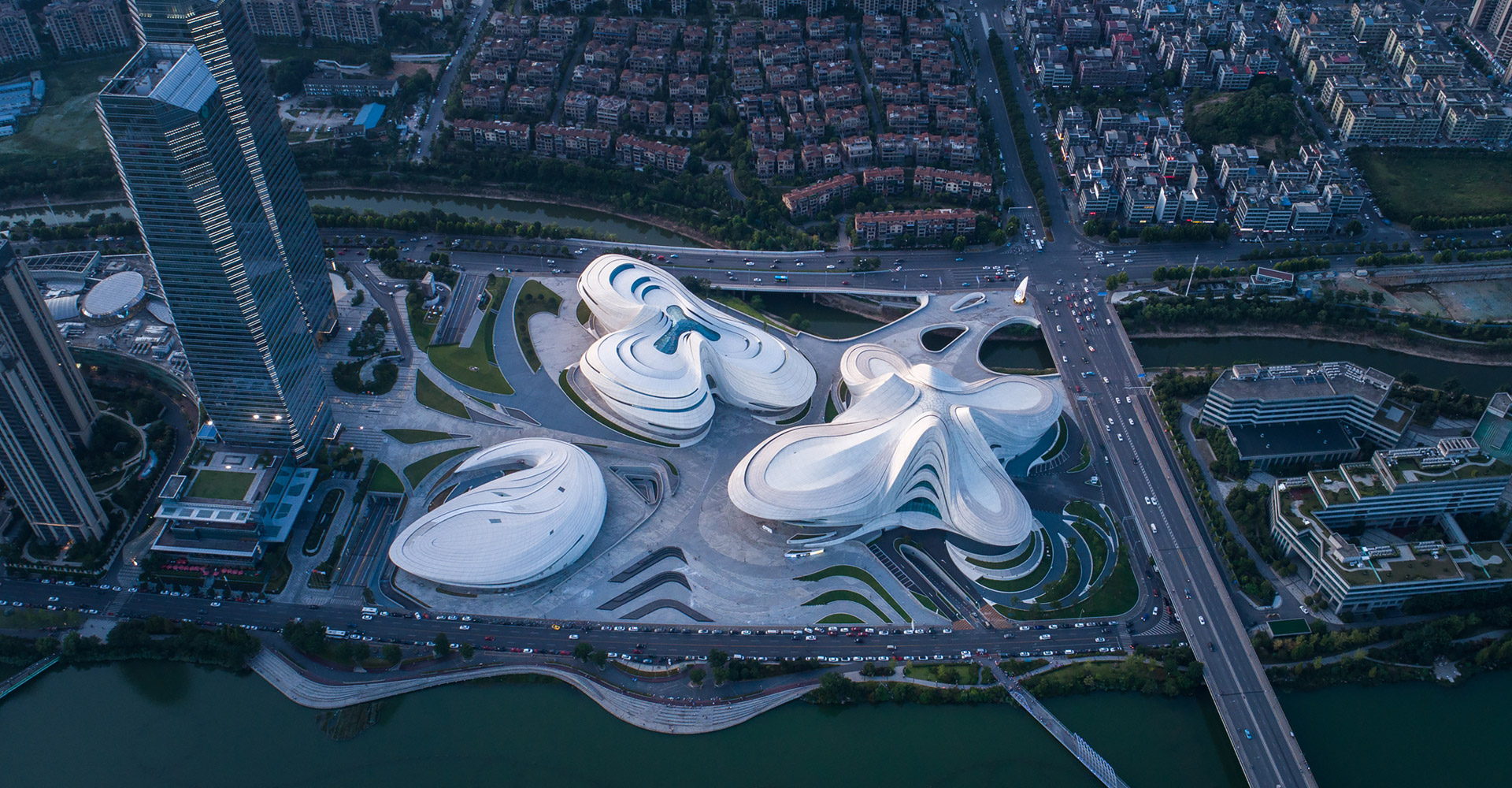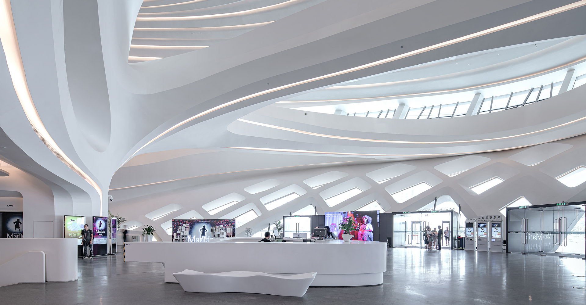 本項(xiàng)目三個(gè)建筑造型緣起于“梅花”,每個(gè)單體由“梅花”的花瓣衍生而來(lái)。大劇場(chǎng)為四片花瓣,藝術(shù)館為三片花瓣,小劇場(chǎng)為一片花瓣,高高低低地散落在梅溪湖畔。三個(gè)抽象的造型均為行云流水般的流線型設(shè)計(jì),主體均為(鋼)框架-鋼筋混凝土剪力墻結(jié)構(gòu)體系,屋蓋均為單層鋼網(wǎng)格結(jié)構(gòu)體系。