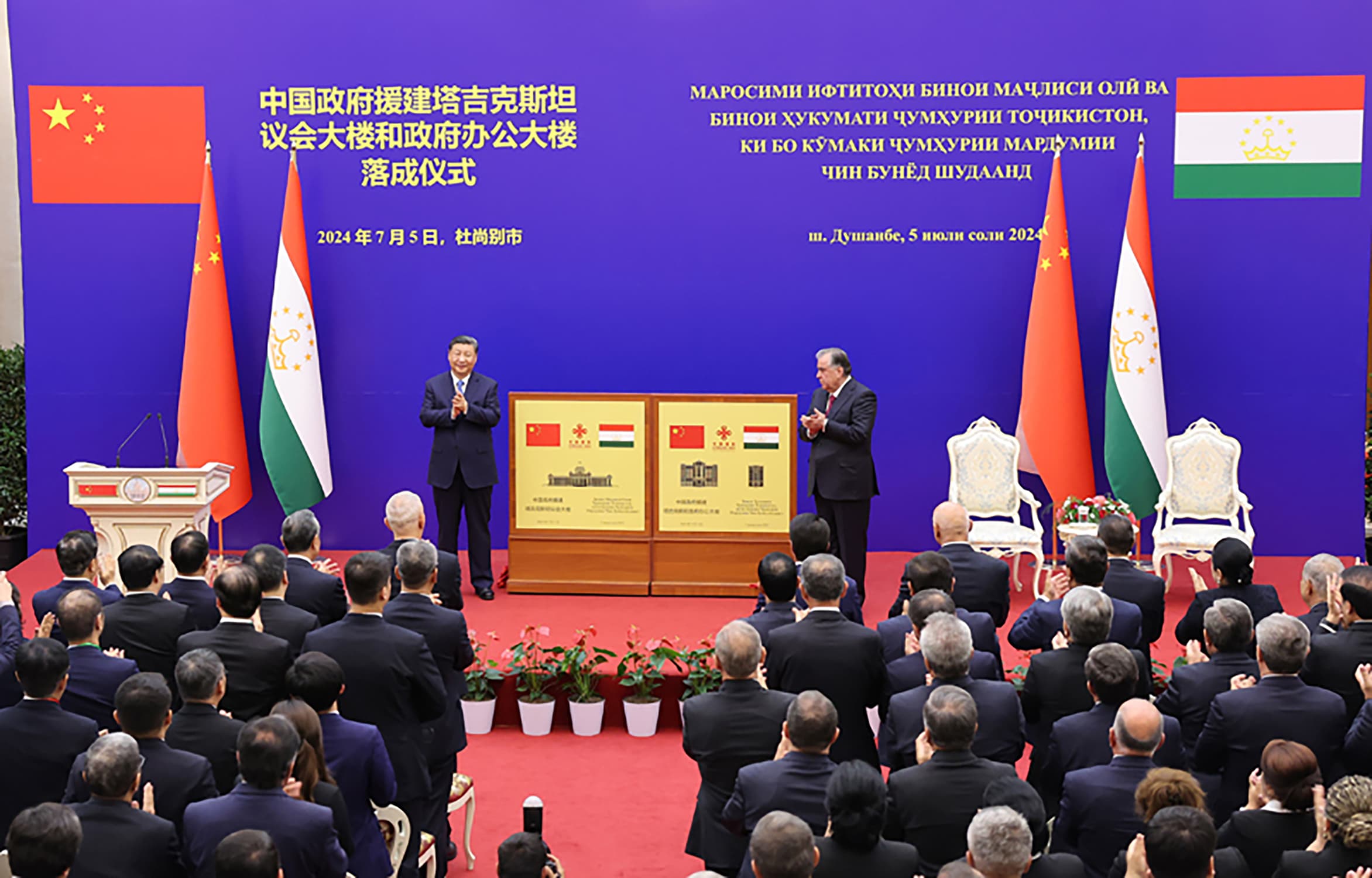 2024年7月5日下午,國家主席習近平同塔吉克斯坦總統(tǒng)拉赫蒙在杜尚別共同出席中方援塔議會大樓和政府大樓落成儀式。兩國元首共同參觀中方援塔議會大樓和政府大樓項目展板,共同為兩座大樓揭牌。